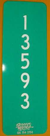 Whether you need standard vinyl letters, personal signs or banners, MC Numbers, DOT Numbers, vehicle graphics, contractor yard signs, custom license plates, 911 address signs or sign supplies the staff at Screen Works can help you out. Stop on in to check out our sign supplies to enhance your business. Much like screen printing, we can work with your graphics or create new ones for you. Our normal delivery time is two weeks or less, but we do have rush service available to help you meet your event dates. Below are some recent samples of vinyl products that we have made. They include a variety of styles such as miscellaneous signs, 911 address signs, and license plates. |